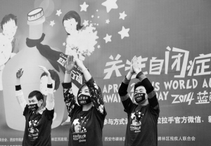 4月2日,志愿者在活动中表演。当日是第七个“世界自闭症日”,西安拉拉手特殊教育中心发起“蓝色行动——关注自闭症儿童大型倡导活动”,以“今天不说话”为口号,通过文艺演出、爱心义卖、自闭症儿童画展等方式,号召大家感受自闭症孩子及家庭所面临的孤独与沉默,为自闭症儿童创造更好的社会环境。