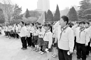 4月3日,记者在周口烈士陵园看到,前来祭扫先烈的人络绎不绝。我市多家单位和学校纷纷组织人员来到烈士陵园祭奠英灵,缅怀先烈。图为少先队员们整齐列队庄严宣誓。记者 王映 摄