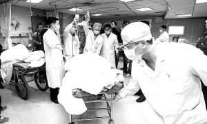 说话间,一辆担架车急匆匆地推进来,几个人推着一位老太太冲进急诊室。老人睁着眼,茫然地看着一边。内科急诊医生李海深跑了过来,询问情况。