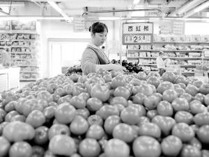 石家庄市一超市工作人员在摆放西红柿(4月8日摄)。