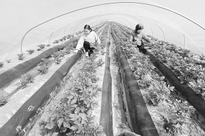 商水县农业、科技等部门积极引导群众发展大棚蔬菜种植,并在资金、技术、信息和销售等方面搞好服务,受到群众的欢迎。图为商水县城关乡瓦房店村村民正在管理土豆苗。 记者 岳建辉 通讯员 刘飞 摄