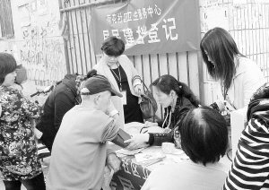 昨日,川汇区荷花社区医务人员为辖区居民进行健康档案登记,同时为居民免费做健康体检。图为该社区文化小区体检登记现场。(王秋来 摄)