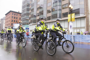 4月15日,在美国马萨诸塞州波士顿,警察骑车经过去年马拉松爆炸案发生现场。当日,波士顿举行仪式纪念去年马拉松爆炸案的遇难者和受伤者。2013年4月15日下午,波士顿国际马拉松比赛现场突发两起爆炸,造成3人死亡,超过260人受伤,震惊美国社会。均为新华社发