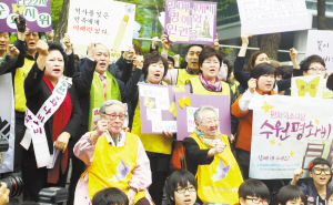 4月16日,在韩国首尔,两名二战期间被迫充当日军“慰安妇”的韩国老人参加抗议集会,呼吁日本政府尽快解决慰安妇问题。当日,韩日两国政府在韩国首尔举行局长级会谈,就日本二战期间在朝鲜半岛强征女性充当“慰安妇”问题展开讨论。