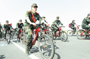 4月16日,边防官兵在沈阳市沈北新区集体骑行。当日,辽宁边防总队沈阳政治工作协作区开展了主题为“低碳生活体验日”的自行车绿色出行活动。来自教导大队、沈阳边防检查站等五家单位的百余名官兵集体骑行,倡导绿色出行。(新华社发)
