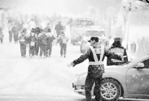 4月17日,交警在新疆巴里坤县街头指挥交通。当日,新疆哈密地区巴里坤哈萨克自治县迎来大雪天气,气温骤降重回“冬日”。降雪造成该县部分道路积雪严重,给人们的交通出行带来不便。