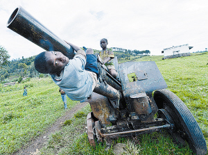4月16日,在戈马北部的一座小镇基班巴,一名孩童在被遗弃的加农炮上玩耍。今年以来,随着刚果民主共和国加大了对反政府武装的进攻态势,该国东部的反政府武装节节败退,曾经被叛军占领的戈马城如今渐渐远离战乱,趋于平静。