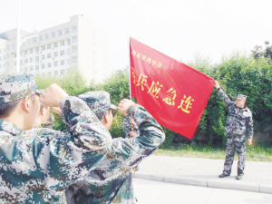 近日,西华县人武部组织新入队民兵宣誓,教育民兵忠实履行国防义务,牢记肩负的神圣使命,听党指挥、服务人民、英勇善战,在构建和谐社会、维护社会稳定、支援地方经济建设中站排头、创佳绩。图为该县应急连新入队民兵面对队旗宣誓。