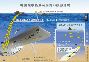 韩国海洋警察厅装备技术局长高明锡表示,通路的持续开拓将使船体内搜索作业难度降低,通路增加后,一方面下潜速度更快,另一方面可同时有多名潜水员下潜。