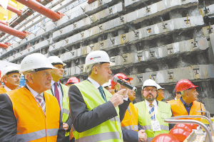 4月19日,在土耳其伊斯坦布尔,土耳其总理埃尔多安(前左二)视察海底隧道工地。
