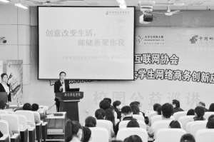本报讯(记者 窦娜/文 通讯员 范建峰/图)4月22日,“邮储银行杯”第七届全国大学生网络商务应用大赛(简称全国大学生网商大赛)校园公益巡讲走进周口师范学院,由此拉开了邮储银行周口市分行“网络金融进校园”的序幕。