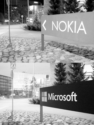 这张拼版照片显示的是位于芬兰埃斯波市的原诺基亚总部换上微软标志前后的对比。