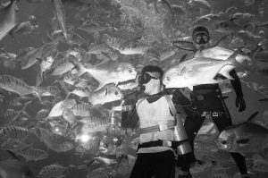 ▲5月2日,“海洋圆梦计划——体验海洋动物饲养员的一天”公益活动在山东烟台海昌鲸鲨馆展开,3位市民在专业饲养员的带领下与海洋动物亲密接触。