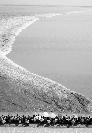 5月1日,游客在浙江海宁盐官观潮景区观赏钱江潮。今年“五一”正逢农历四月初三钱塘江大潮汛日,浙江海宁盐官观潮景区“五一”单日游客接待量创新高。
