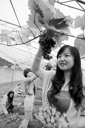近日,河北省张家口市宣化区小慢岭村草莓合作社发展的草莓葡萄立体栽培获得成功。该合作社引进了早熟和中晚熟的温室葡萄秧,在温室草莓大棚内开展立体培育。葡萄的成熟期与草莓的成熟期互相搭配,有效利用了大棚空间,形成了葡萄与草莓一起采摘上市的新型农业景观,拓宽了致富的门路。图为游人在温室大棚内采摘草莓和葡萄。 陈晓东 摄