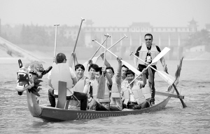 周口首届中华龙舟赛进入倒计时,昨日,来自全市各县市区企业的参赛运动员在沙颍河中州路桥河段随着节奏前进,动作整齐规范。队员们纷纷表示,时间紧任务重,我们一定会赢! (记者 沈湛 摄)