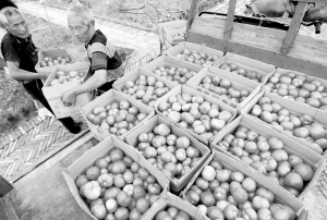 近年来,项城市贾岭镇在推进农业结构调整过程中,引导农民种植绿色无公害蔬菜,使其规模化、标准化、产业集群化发展,让农民得实惠。图为5月13日,在项城市贾岭镇豫东蔬菜基地的大棚里,当地村民在搬运西红柿。 (记者 金月全 摄 )