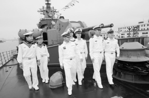 中国海军导弹驱逐舰郑州舰官兵在俄罗斯“瓦良格”号导弹巡洋舰上参观。