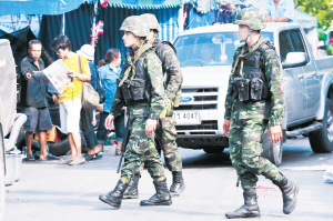 5月23日,在泰国曼谷,泰国士兵在反政府示威者集结点执行警戒任务。据泰国媒体23日报道,军方发动政变后,已经宣布由陆军司令巴育暂时代理总理职务,直到军政府指定新的总理。