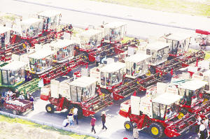 5月23日,河南省安阳市内黄县的大型农机列队待发。当日,内黄县举行农机手跨区作业出征仪式,近百台大型联合收割机出征南下,参加由南向北展开的“麦收会战”。