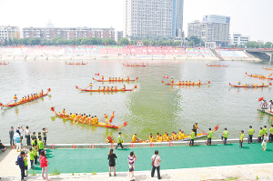 闭幕式上,参赛的龙舟在河水中央,向观众做集中展示。(记者 王映摄)
