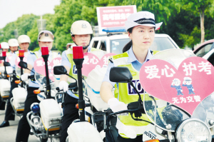 6月4日,安徽省芜湖市无为县交警大队组织10多辆警用摩托车和巡逻车组成高考服务车队,将在高考期间疏导交通,处理突发事件,保障考生顺利参加考试。