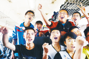 6月6日,参加高考的考生在7504次列车车厢内互相加油鼓劲。当日,在甘肃省天水市麦积区渭南镇火车站,200多名高三考生和陪考家长登上了被当地人称为“绿皮小慢车”的7504次列车,前往40多公里外的天水市区参加高考。天水市周边部分乡镇不设高考考点,坐着火车去赶考的高三学子们已成为当地高考一道别样的风景。