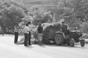 在公路上打场晒粮危害多,不仅影响交通安全,而且还污染小麦、影响市容环境。图为工作人员正在劝止准备在马路上晒粮的农民。记者 王亚辉 摄