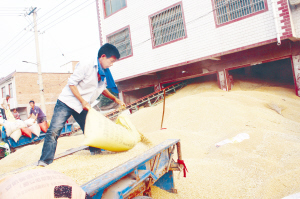 又是一个丰收季。粮食敞开收购政策让项城市农民得到了不少实惠,各镇办均设立了多个粮食收购点,刚刚收割完的小麦,直接拉到收购点就能卖掉。图为秣陵镇一农民正在卖粮。杨光林 凡景锋 摄