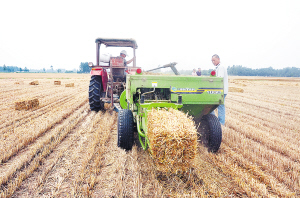 近几年,西华县积极为农作物秸秆找出路,提高农作物秸秆综合利用率。图为该县一秸秆制板企业在麦收后对秸秆进行打捆收购。(记者 张猛 摄)