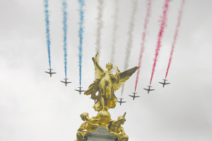 英女王生日庆典在伦敦举行 6月14日,英国伦敦举行飞行表演庆祝女王官方生日。当日,英国伦敦举行盛大的巡游仪式,庆祝女王伊丽莎白二世的官方生日。新华社发