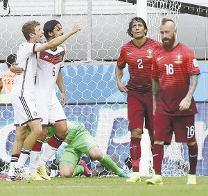 就在人们期待大牌云集的德葡两队上演对攻大战时,比赛形势却呈现一边倒。开场仅10分钟,葡萄牙队的佩雷拉禁区内拉倒格策送给对手点球,穆勒操刀轻松命中。第31分钟德国队卷土重来,克罗斯开出角球,胡梅尔斯冲上头槌破门。