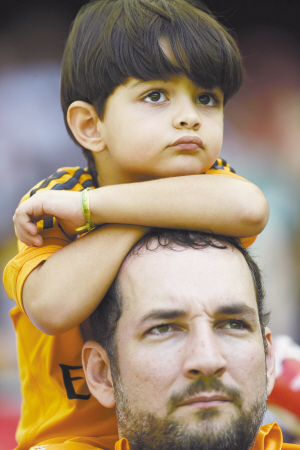 6月16日,一对父子球迷在巴西萨尔瓦多新水源竞技场内等待比赛开始。 新华社记者 杨磊 摄