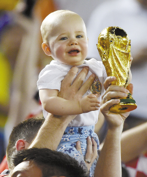 6月16日,一名婴儿被美国队球迷爸爸举过头顶,小婴儿被眼前的“大力神杯”和全场的热情惊吓住了。 新华社记者 吕小炜 摄