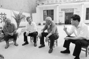 随后,在陈志伟的陪同下,邓凯来到该村村委会大院,察看村党建办公室和党员干部远程教育终端接收点及群众路线教育实践活动的相关资料。在村委会大院的树荫下,邓凯与村干部、村“三老协会”成员、村民代表一一握手,与大家一起坐在小板凳上亲切交流。当了解到王楼行政村注重发挥村“三老协会”的作用,多年没有发生群众上访现象后,邓凯十分欣慰地说,你们能做到这一点,很不容易。这说明村党支部战斗堡垒作用发挥得好,村“三老协会”的调处化解作用发挥得好。
