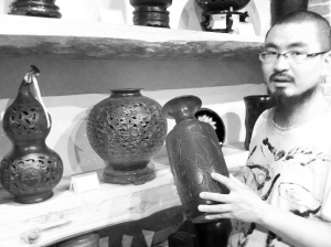 6月12日,淮阳一民间工艺师在展示新作——黑陶荷花瓶。淮阳县近年来以弘扬伏羲文化为核心,深入挖掘历史文化元素,对泥泥狗、布老虎、黑陶等旅游产品进行深度开发,不断提高产品档次,增强市场竞争力。(记者 侯俊豫 通讯员 靳淑君 摄)