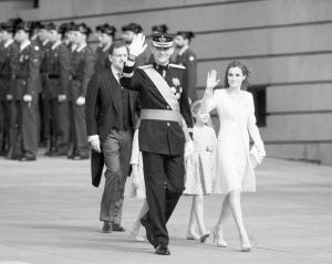 西班牙国王费利佩六世登基 6月19日,在西班牙马德里,西班牙国王费利佩六世(前)出席登基典礼前的阅兵仪式。新华社记者 谢海宁 摄