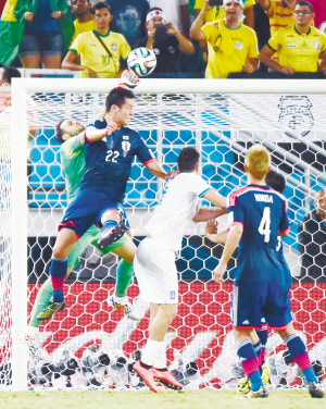 ↓6月19日,希腊队守门员奥·卡尔内希斯(左一)与日本队球员吉田麻也在比赛中争抢。当日,在巴西纳塔尔沙丘竞技场进行的2014年巴西世界杯小组赛C组比赛中,希腊队以0比0平日本队。新华社发