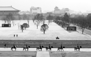 “丝绸之路”申遗成功 一列马队从西安的大明宫遗址公园的含元殿遗址前经过(2011年12月7日摄)。6月22日,中国与吉尔吉斯斯坦、哈萨克斯坦联合提交的“丝绸之路”获准列入世界遗产名录。 新华社发