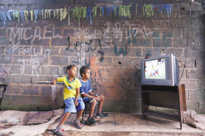 6月17日,在巴西首都巴西利亚郊区的贫民窟,两名男孩观看电视上播出巴西世界杯足球赛巴西队与墨西哥队的小组赛。新华社/路透社