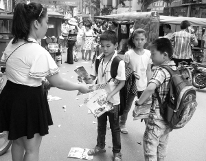 昨日上午,在市区六一路小学附近,不少发放暑期补习班宣传单的人员在接孩子的家长和放学的孩子中间不停地穿梭,见人就递。小学即将进入期末考试时间,各种培训机构也抓住时机,纷纷在学校周围发放假期辅导的宣传单。(记者 王映 摄)