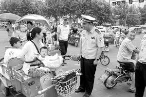 6月25日上午,市交警支队民警在七一路与中州大道交叉口交通岗,查处行人、非机动车及机动车闯红灯、无牌无证驾驶等各类交通违法行为。图为支队长谢伟在规范交通秩序。 (记者 陈永团 通讯员 许素云 张炎 摄)