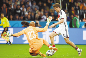 德国队由于开场后传球成功率一直不高,有威胁的攻门次数非常有限。第38分钟,厄齐尔中前场拿球后突施冷箭,可惜射门太正无功而返。仅仅3分钟后,克罗斯禁区外围一脚打门被门将扑出,跟进的格策补射,但射门再被表现神勇的门将封堵。