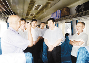 随后,徐光、刘继标一行走进车厢,与旅客亲切交谈。市民李如成的孩子在苏州工作,以前每次去看望孩子都坐大巴。得知有了去上海的火车,他早早就买好了票,赶第一趟车去苏州看孩子。看到徐光等市领导走上列车,李如成激动地说:“市委、市政府真是给咱老百姓办了一件大好事啊。原先坐车非常不方便,想坐火车的话,要么去郑州,要么去商丘、阜阳,周口到上海列车的开通确实为周口人民带来了很大方便。”看着大家的笑脸,听着满意的回答,徐光十分高兴地说:“今天是七一,既是共产党成立93周年的纪念日,也是周口通行上海的第一班车,大家是见证者也是幸运者,祝贺大家。”