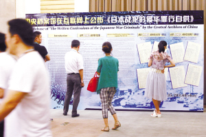 7月3日,记者在新闻发布会前浏览展板上的内容。《日本战犯的侵华罪行自供》发布网址:http://61.135.203.68/rbzf 新华社记者 沈伯韩 摄