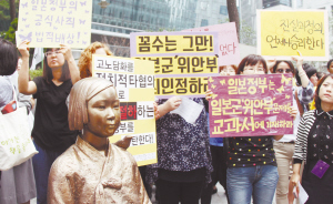 韩国民众在日本大使馆前举行多轮抗议示威活动 7月2日,在韩国首尔的日本驻韩国大使馆前,民众在慰安妇少女像旁手持标语参加抗议活动。当日,韩国民众聚集在日本驻韩国大使馆前,举行多轮抗议示威活动,要求日本政府向慰安妇谢罪,并强烈反对日本通过解禁集体自卫权的法案。