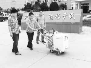 商水县公路管理所多方筹资购买沥青灌缝机等设备和材料,及时组织养护专业队对辖区管养的道路病害实施沥青灌缝作业养护。图为工作人员对沥青灌缝机进行安装调试。(记者 岳建辉 摄)