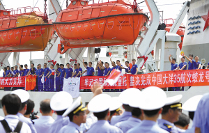 7月4日,“向阳红09”船搭载“蛟龙”号离开福州马尾码头开往西北太平洋。当日,搭载我国“蛟龙”号载人潜水器的“向阳红09”船从福建福州起航,奔赴西北太平洋中国大洋协会富钴结壳勘探区执行2014至2015年试验性应用航次(中国大洋第35航次)第一航段科考任务。 新华社记者 魏培全 摄