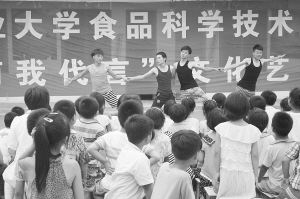为帮助大学生开展暑期“三下乡”社会实践活动,共青团项城市委积极搭建平台,与企业、学校等联系,在关爱留守儿童、医疗卫生服务、科技支农推广等活动中提供优质服务,引导广大青年学生在社会实践中了解国情、省情、社情,培育和弘扬社会主义核心价值观。图为河南农业大学的学生在莲花办事处韩小庄小学为留守儿童举办文艺演出,受到孩子们和家长的欢迎。(张永久 摄)