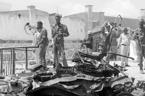 索马里议会大楼附近发生自杀式袭击 7月5日,在索马里摩加迪沙,安全人员查看自杀式汽车炸弹袭击现场。索马里警方5日说,位于摩加迪沙的索马里议会大楼附近当天发生自杀式汽车炸弹袭击,目前已造成至少两名士兵丧生,另有4人受伤。索马里青年党宣称制造了此次袭击事件。 新华社发